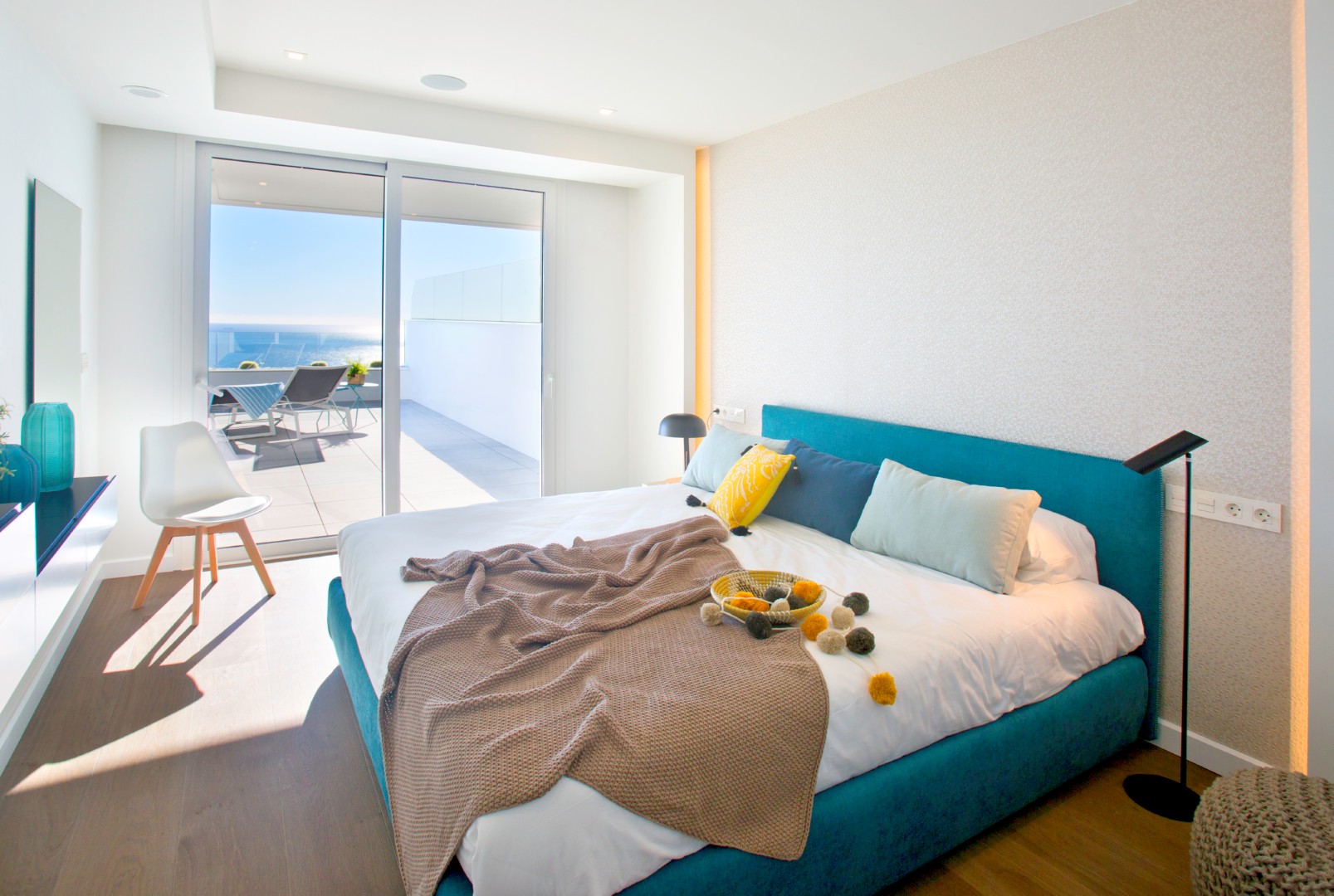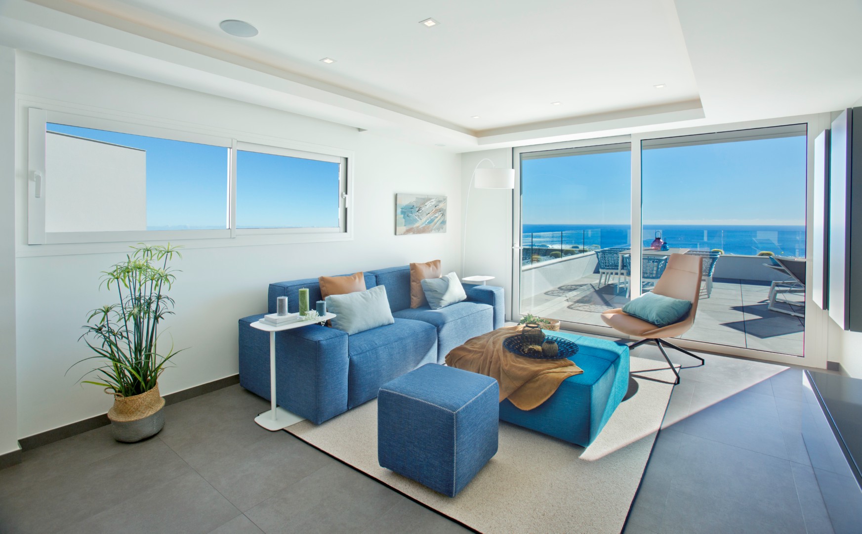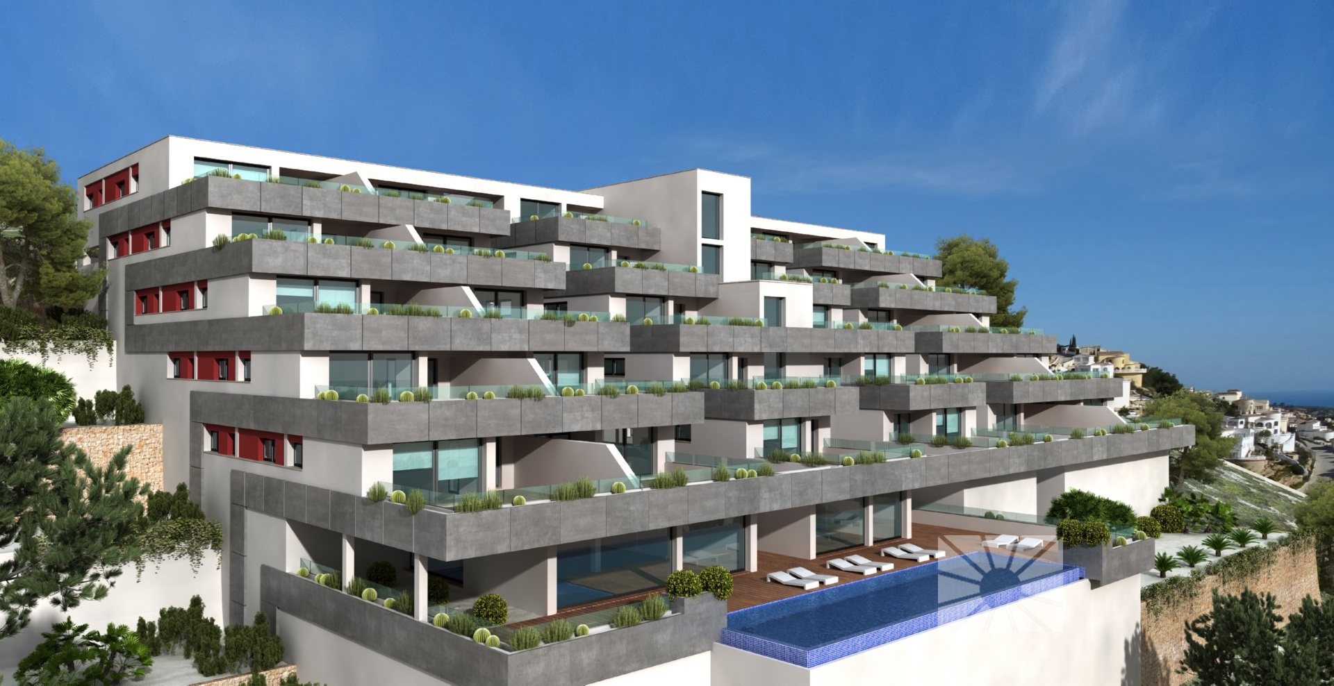 • Overview: A development that, due to its location, enjoys the spectacular sea view of which Cumbre del Sol is known internationally. A truly perfect place for those who want to enjoy the Mediterranean climate and beautiful sunrises, in a private residential complex by the sea. The apartments are distinguished by their modern and elegant design and their large surfaces: the smallest has a living area of ??more than 100m² and a terrace of 47m², excluding communal areas. With two models with 3 bedrooms and 2 bathrooms and a model with 2 bedrooms and 2 bathrooms, so you can choose which fits best with your lifestyle. These properties are perfect for living all year round or enjoying during the holidays, thanks to a careful layout and their luxurious fixtures and fittings, with underfloor heating, air conditioning, home automation, wall cladding with wood panels or porcelain, wooden floors on terraces, custom-designed Krion bathroom furniture, ..., using high-end brands such as Inalco, Grohe, Krion, Mosso, Hakwood, Vescom, Duravit, among others. This development would not be complete without the spacious communal areas, so that during the summer months you can enjoy the rectangular outdoor infinity pool with a large terrace and the covered wellness area with heated swimming pool, jacuzzi, sauna and Turkish bath in the rest of the year; everything you need to relax by the sea. PRICES FROM € 430,000.